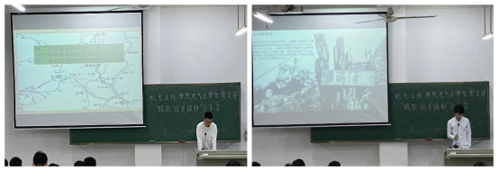 党支部副书记刘锟同志就分享会说明了青年大学生、青年党员的信仰问题。吾辈虽身处安逸,就必须饮水思源;我们年轻党员应当不忘先辈初心,牢记使命,学习老党员为了国家随时奉献自己生命的大无畏精神,在学习、生活中应当践诺当先锋,争锋做表率。
