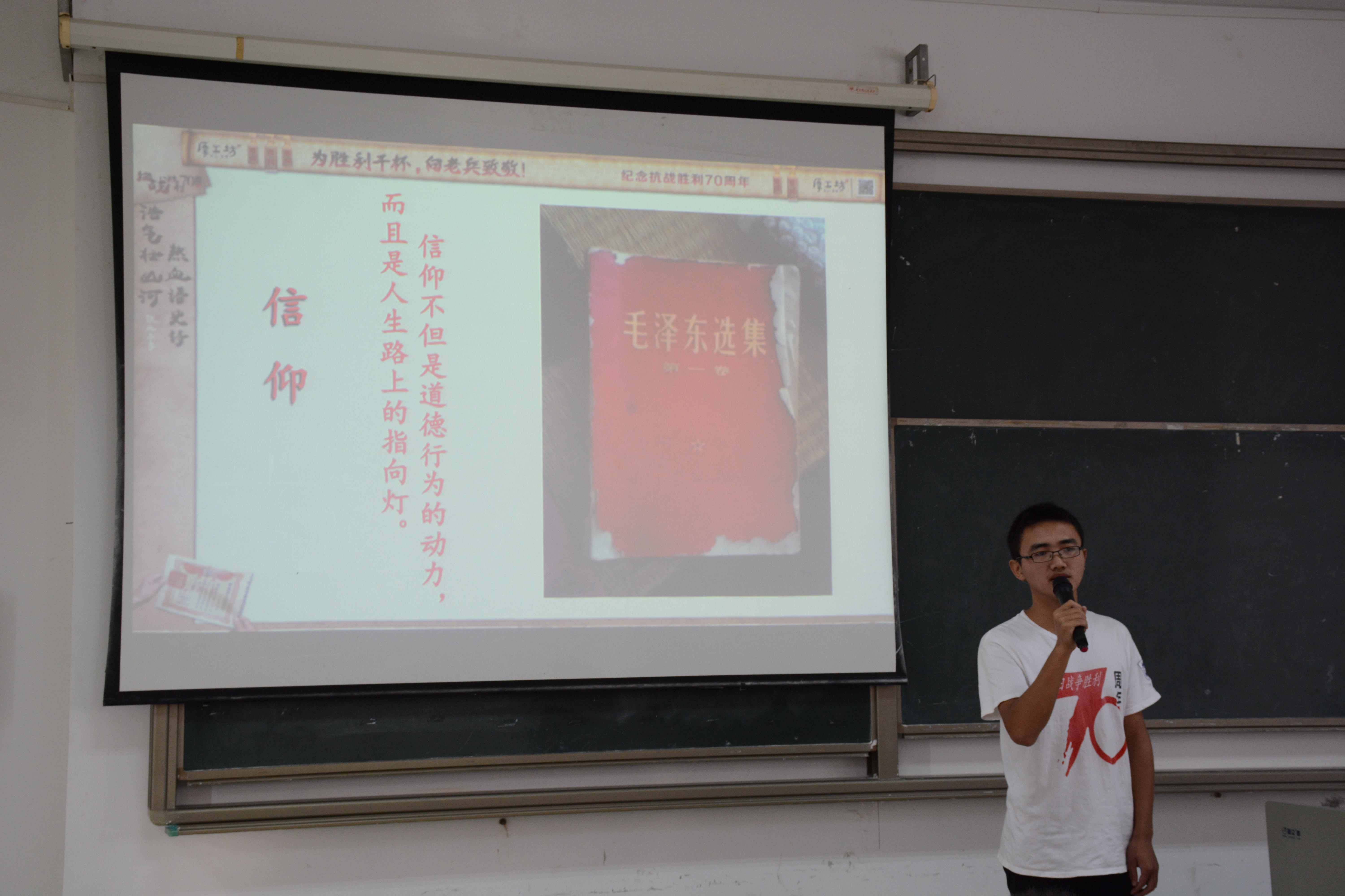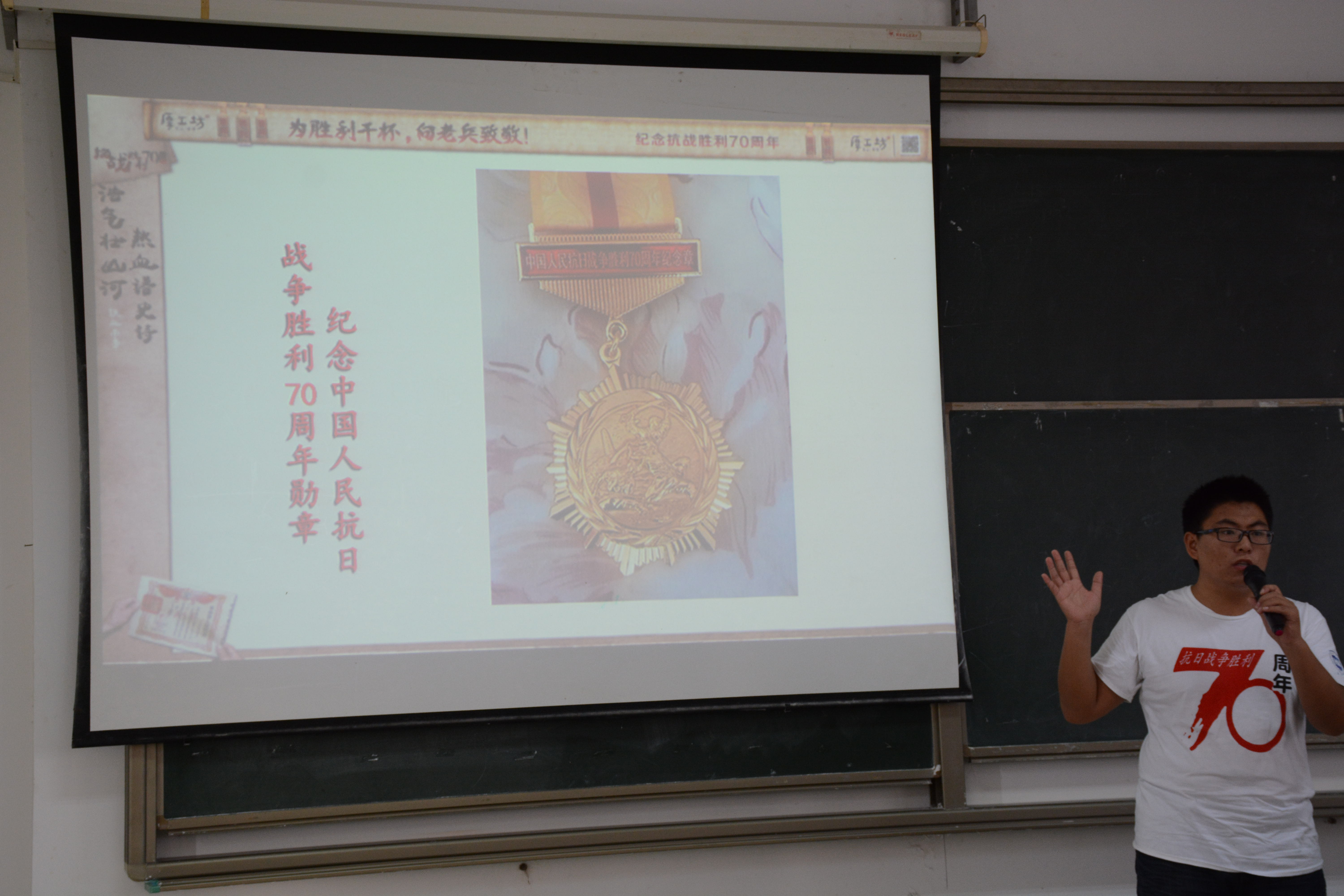 12月13日上午,在3号教学楼212课室,jinnianhui金年会诚信至上“致远传承”寻访团为第十一期党课积极分子带来了一场别开生面的党课——分享了团队暑期纪念抗日战争胜利70周年寻访活动经历、体验和收获。出席活动的有辅导员崔建兵、崔万春老师,分享成员有起家林、朱凯峰、李贺、杨建平、李庆庆等五名同学。会议由机械系第一学生党支部宣传委员金杯主持。