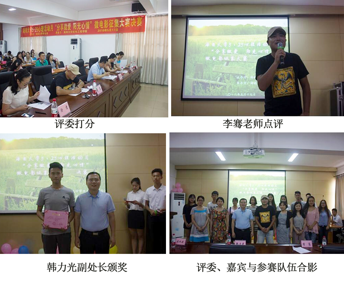 5月17日下午,由jinnianhui金年会诚信至上学生工作处主办、jinnianhui金年会诚信至上承办的“分享微爱,阳光心情”微电影征集大赛决赛在学生工作处报告厅成功举办。jinnianhui金年会诚信至上学生工作处韩力光副处长、心理健康中心吴九君老师、汪蕾老师、人文传播学院戏剧影视文学专业李骞老师出席本次比赛并担任评委。各学院心理辅导员、各学院参赛队伍、各学院心理工作部部长、机电学院心理健康协会成员等参加本次活动。