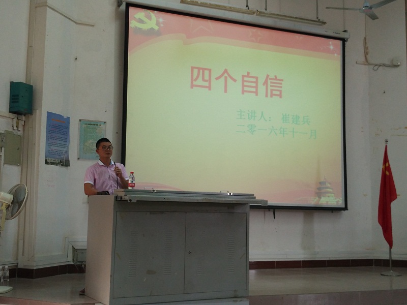 崔建兵老师就“道路自信、理论自信、制度自信和文化自信”向学员们阐述了中国特色社会主义蓬勃发展的现状。谈到道路自信时崔老师指出了中国发展道路创造的奇迹和新中国从成立初期至今发生的翻天覆地的变化,以及中国的国际地位实现的历史性飞跃。就理论自信而言,他指出与时俱进的科学理论仍需要我们齐心协力投入到中国特色社会主义建设中。当谈到制度自信时,针对中国制度为什么能赢,崔老师又列举了国外选举的一些弊端,表明了只有像中国选举制度即全国人民代表大会制度,才能选出真正对国家有益,能促进社会发展的领导人。作为全世界唯一文化与文明双存在的国家,崔老师最后讲述了中国文化自信的底气在哪里。崔老师要求我们要坚定自己的理想信念,始终跟着党走!