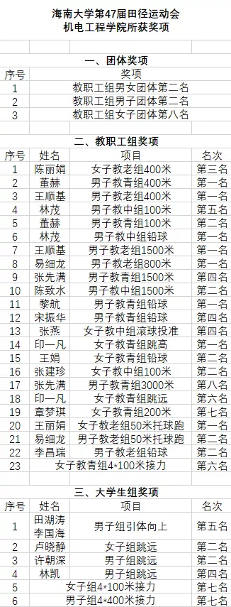 11月15日,田径运动会的最后一天,赛事气氛达到了最高潮,每一位选手都拼尽全力去争夺胜利。下午16时,经过三天激烈角逐,jinnianhui金年会诚信至上女子第47届田径运动会,在海甸校区第一田径场圆满落幕。金年会取得了教职工组男女团体第二名、教职工组男子团体第二名和教职工组女子团体第八名,机电运动员也取得了优异成绩。