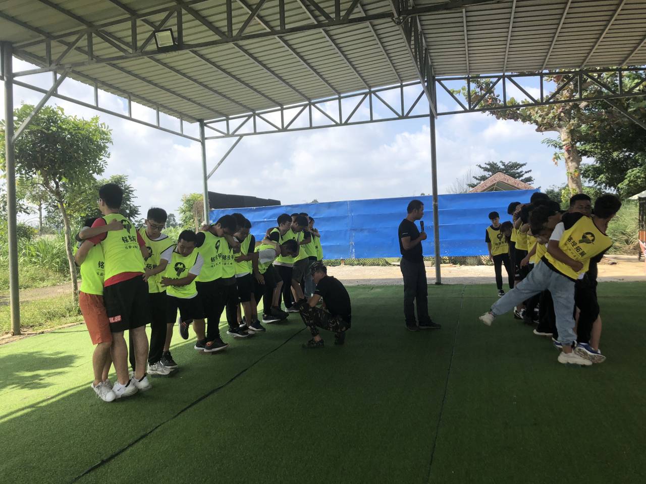 16日上午进行了建立红色军团、无敌战车与冰海沉船三个项目。在建立红色军团项目中,所有参与人员分为了两队并分别选出了队长、副队长与旗手,两队队员通过默契的配合摆出了属于他们自己的队伍logo。无敌战车项目中各队队员进入履带中前进,每个人都尽了最大的努力,成功让自己的“战车”冲破终点。上午最后一个项目是冰海沉舟,要求用6块半的木板将15人渡过冰海,在大家的通力合作下,最后有一支队伍成功完成了这项艰巨的任务,每个人都在其中付出了自己的努力并为团队做出了牺牲,正如教练说的话:“你自己轻松了,别人就很难了”。