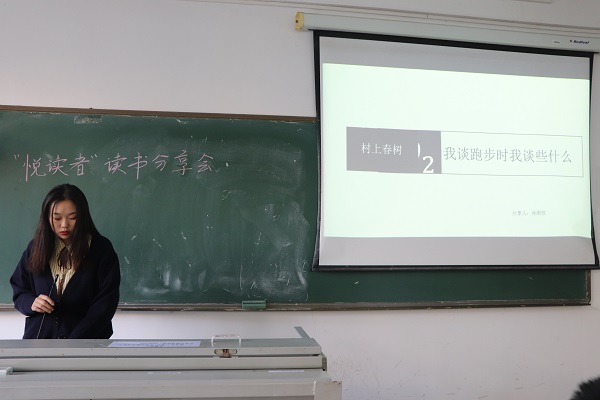 孙雨欣为同学们推荐了村上春树的《当我谈跑步时我谈些什么》。她通过对这本书的阅读了解了作者在从事跑步和写作这两件事时的经历、体验和思考到的一切,在她看来,这本书中充满了清澈的理性。