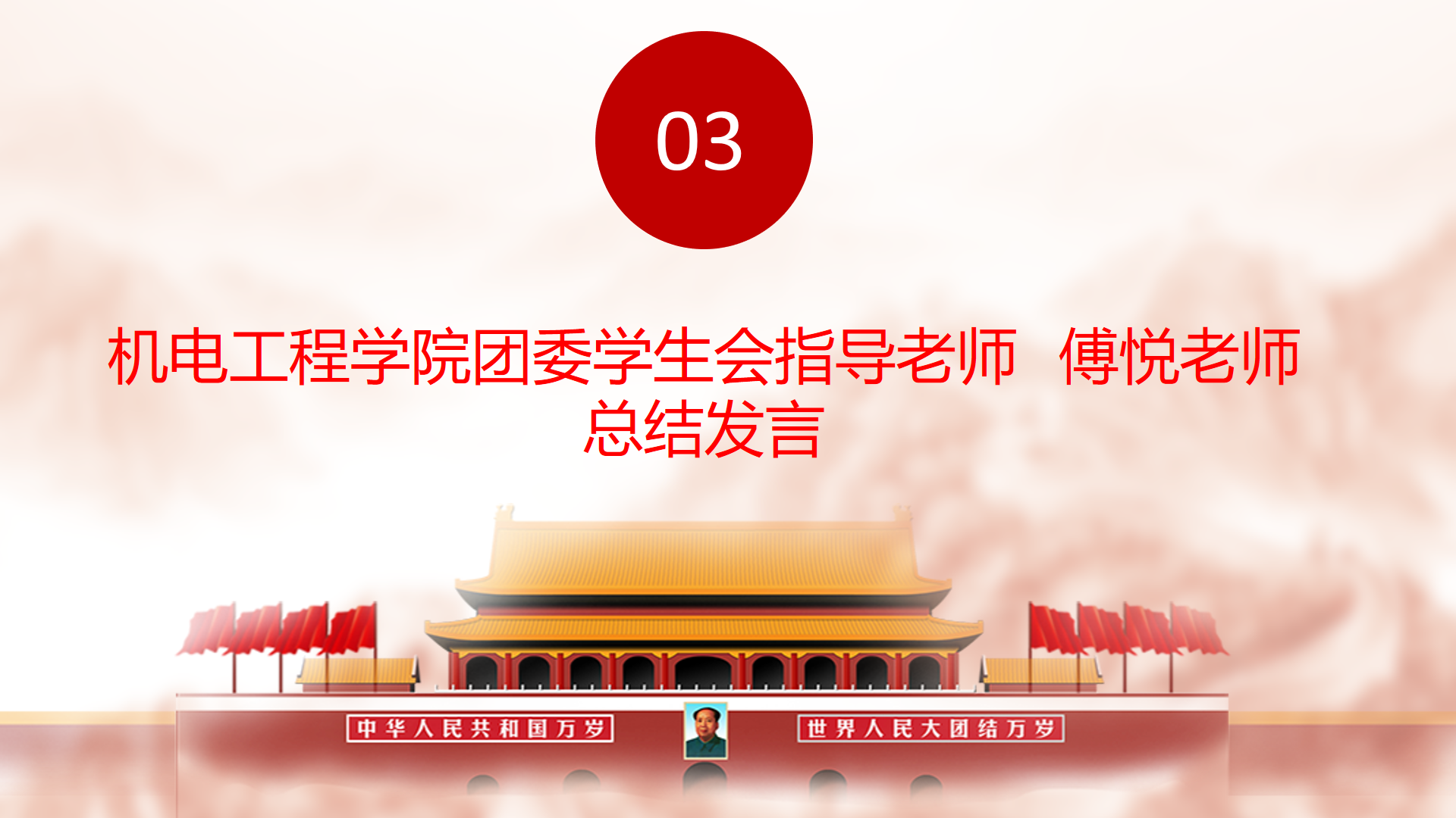 活动的最后,机电团委学生会的指导老师傅悦老师做了总结讲话。她表以抗日战争、朝鲜战争中为国捐躯的青年,以及上世纪60年代在戈壁滩为祖国研究两弹一星的党员青年为例,希望当代青年能够学习榜样的力量,能够在国家需要的时候站出来,成为国家的脊梁。她希望我们机电的学子们能够了解这个世界,认识中国所处的位置,在中华民族艰苦奋斗过程体会中华民族的伟大与美好。最后,傅悦老师祝愿jinnianhui金年会诚信至上的学生们五四青年节快乐,并表达了希望我们向上想好,为中华民族伟大复兴的中国梦而努力奋斗。