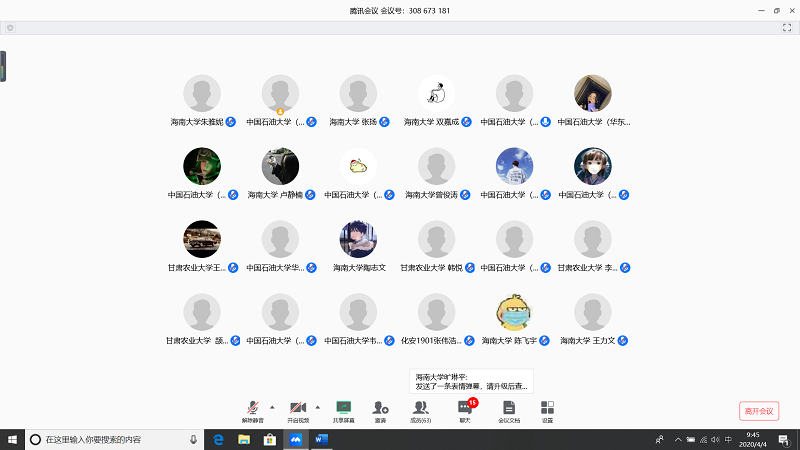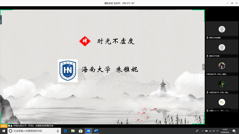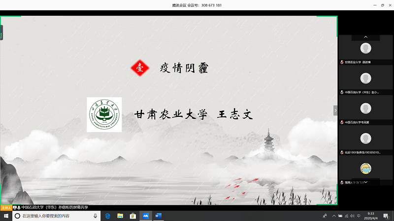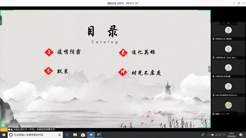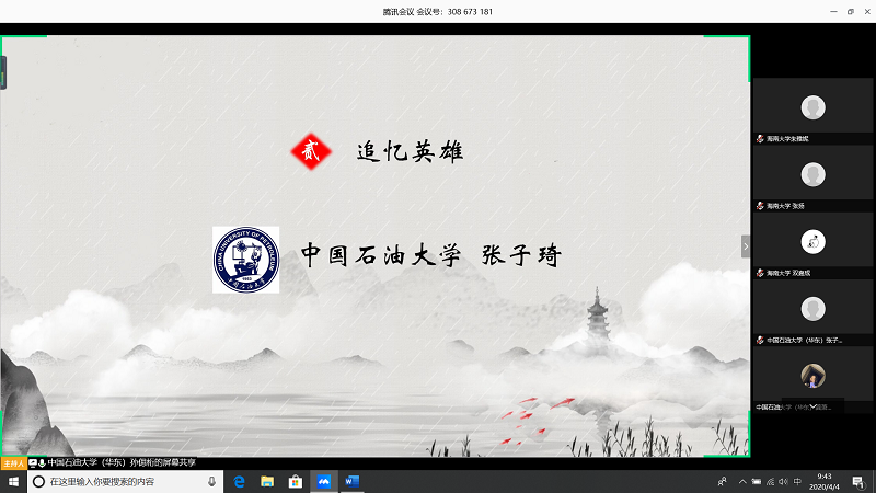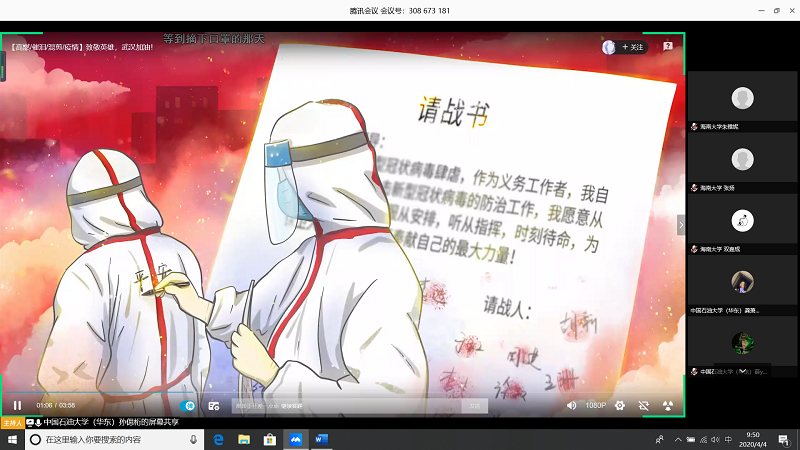 会上,由甘肃农业大学王志文同学带我们回顾疫情,虽然国内疫情已经有所缓解但是同学们还是不能放松警惕;中国石油大学(华东)张子琦同学带领大家向抗疫英雄致敬,十点开始全体起立默哀三分钟;jinnianhui金年会诚信至上朱雅妮为大家强调线上上课等同于课堂教学,在家学习不能懈怠,合理规划疫情期间的学习和课程安排。