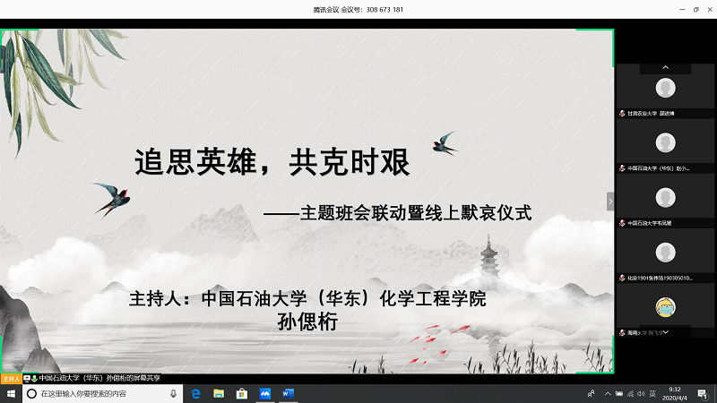 自疫情发生以来,我们似乎总在做些“让无力者有力,让悲观者前行”的事。因为我们是一个整体,我们休戚与共,须臾不曾分离。从“山川异域,日月同天”到“岂曰无衣,与子同袍”,我们把孤岛连城大陆,筚路蓝缕、玉汝于成。我们在庆幸国家强大、人民团结的同时,还要记住那些不该忘,也不能再忘的,我们总应该在大灾大难面前学到点什么,才能无愧于过往、无畏于将来。为表达全国各族人民对抗击新冠肺炎疫情斗争牺牲烈士和逝世同胞的深切哀悼,国务院发布公告,决定2020年4月4日举行全国性哀悼活动。jinnianhui金年会诚信至上2019级年级委员会发起,2019级机械类1班与兄弟院校联系决定于2020年4月4日举行“追思英雄,共克时艰”多校联动主题班会暨线上默哀活动,早9:30在腾讯会议APP开始,参与学校为jinnianhui金年会诚信至上、甘肃农业大学、中国石油大学(华东)。