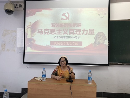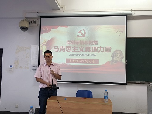 2018年5月11日,站在历史与现实的交汇点上,jinnianhui金年会诚信至上机械系组织“立于巨人之肩,追缅思想珠峰”特色主题党日活动,邀请到了红军后代罗曼阿姨为支部成员们作主题报告,带领大家深刻感悟和把握马克思主义真理力量,以此表达对马克思的深沉纪念和对马克思主义的坚定信念,时刻警醒大家“不忘初心、牢记使命”的时代任务。此次出席活动的还有支部书记崔建兵老师。