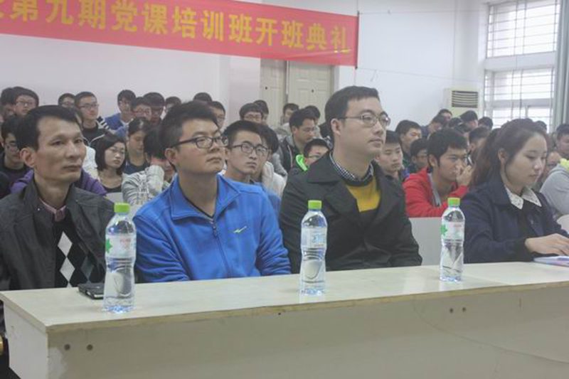 一曲振奋人心的《国际歌》为本次开班典礼拉开了帷幕。崔万春老师对学员们做了动员讲话并提出了几点希望,他指出参加党课培训以及学习党的知识的重要意义;希望学员们树立正确的入党动机;希望学员们珍惜本次学习机会并在以后的学习和生活中认真学习党的理论知识,增强心中的自豪感与民族责任感。接着,总结了学院一年来的学生党建工作,对党员发展情况进行了通报,宣读了参加宣誓的新接收预备党员名单。全体预备党员持立正姿势,面向党旗,举右手握拳,在领誓人王寅老师的带领下庄严宣誓,誓为共产主义奋斗终身。随后,2012级正式党员谢东原作为代表发言,总结两年来自提交申请书到成为正式党员的感悟与收获,并对新一届入党积极分子寄予厚望。2014级入党积极分子洪锦文作为代表发言,表达了本期全体学员严格遵守党课纪律,认真学习党的知识,接受党的教育的决心。黄国标书记在最后对新加入的优秀学员表示热烈的祝贺,并向同学们介绍了学院党委的工作要求及安排,希望能够帮助积极分子各方面得到收获和提高,达到党员的标准与要求。