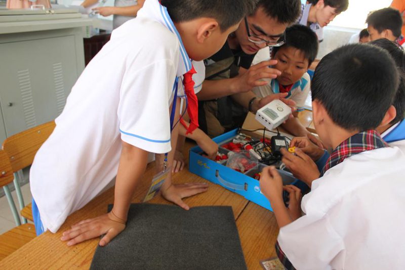 在多媒体教室,首先科技服务团成员高建伟播放一些有关制作机器人的视频,并向小学生们宣讲实践动手的重要性。高建伟向同学们演示了机器人的拆装步骤,并着重强调了过程中的注意事项。同学们认真仔细地观察,并不断的记忆;接着,科技服务团成员将学生分为12组,每组由4到5名同学及科技服务团一名老师组成。随后,科技服务团老师把学生带到指定的场地,指导同学们自行拆装机器人,同学们不断尝试和改进,直到自己亲手组合成功。