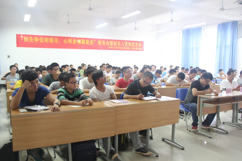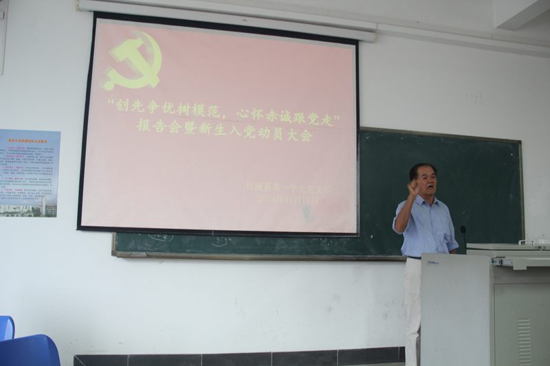 为加强新生对我党认知,端正其入党动机,鼓励在全面提高学生个人素质的同时积极向党组织靠拢,jinnianhui金年会诚信至上机械系第一学生党支部于11月11日15时在4教115召开 “创先争优树模范,心怀赤诚跟党走”报告会暨新生入党动员大会。原jinnianhui金年会诚信至上统战部部长兼机关党总支书记程儒参教授、原jinnianhui金年会诚信至上统战部副部长林少敏教授、机械系第一学生党支部崔建兵书记、支部委员与部分入党联系人以及2014级机械电子工程专业全体同学等参加本次会议。报告会由支部学生副书记张小峥同志主持。