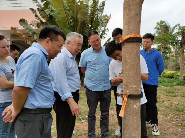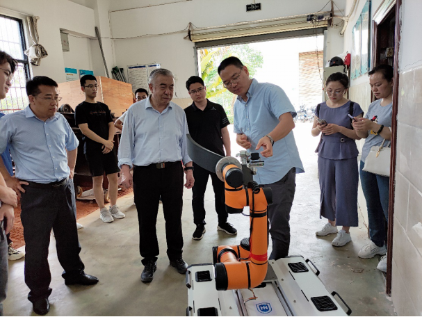 座谈会后,陈学庚院士参观了金年会农机实验室,张喜瑞教授对农机团队的科研情况进行了汇报和实机展示,着重介绍了智能化割胶装备的研发进展,陈学庚院士肯定了农机团队的工作,并就展示的两种割胶装备提出了改进方案。