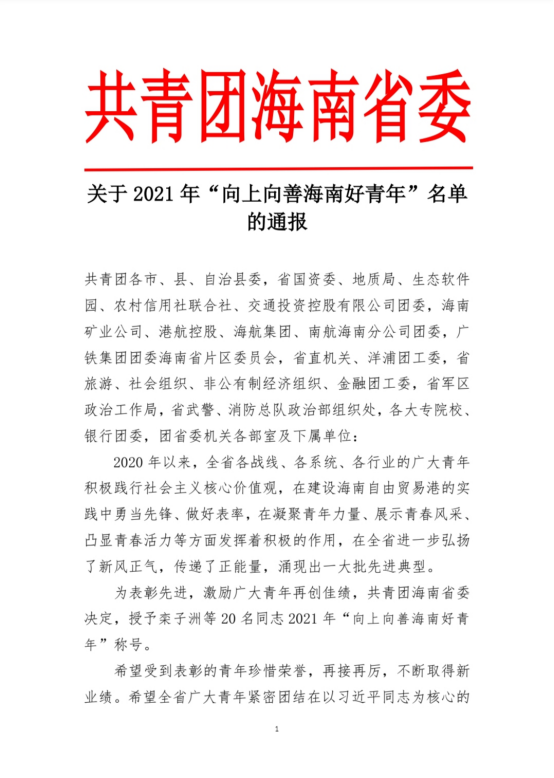 近日,金年会学生许阐(本科生)被共青团海南省委评为2021年“向上向善海南好青年”之“创新创业好青年”。