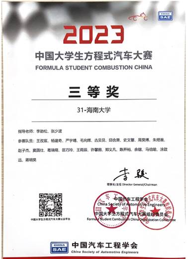 金年会南海方程式赛车队携第四代赛车亮相2023FSCC,不仅在高速避障测试中拿下了1:07.62的优秀成绩,而且在赛场上展现了队史最佳的动态性能,耐久赛最快圈速为1:01.791,位列全场第十,实现了赛车在动态项目的新突破。经过五天的激烈角逐,金年会南海方程式赛车队获得2023年中国大学生方程式汽车大赛三等奖。
