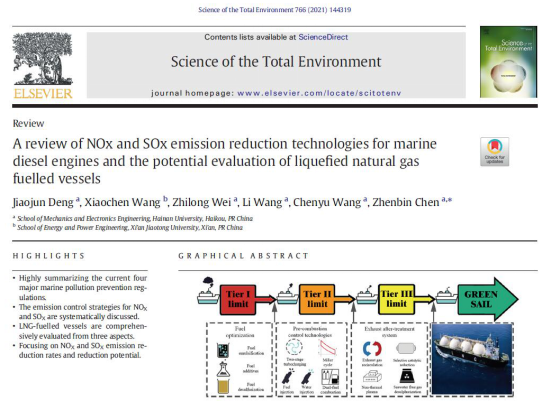 2021年4月20日,Elsevier旗下期刊《Science of the Total Environment》正式出版题为“A review of NOx and SOx emission reduction technologies for marine diesel engines and the potential evaluation of liquefied natural gas fuelled vessels”的综述论文(doi:10.1016/j.scitotenv.2020.144319),该论文以jinnianhui金年会诚信至上为第一单位,2019级机械工程专业硕士生邓交均为第一作者,导师陈振斌教授为通讯作者。《Science of the Total Environment》为SCI源刊,影响因子为6.551,中科院一区top期刊(2020年12月最新升级版)。
