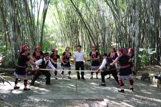 采访结束后,在村民委员会主任的介绍下,调研团来到村子里的黎苗文化大舞台。充满苗族文化气息的舞台和身着苗族文化服饰的苗族人都让调研团成员深刻领略到了苗族特色文化的魅力。最美苗族传统舞蹈——竹竿舞也在黎苗文化大舞台上展现着独属于少数民族舞蹈的美,竹竿舞的配乐和优美典雅的动作带着浓厚质朴的民族气息。最后,调研团在一场苗族献给共产党的舞中结束了一天的调研任务,舞蹈中苗族人民对共产党淳朴真挚的感情深深地打动了调研团全体成员。