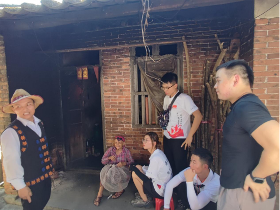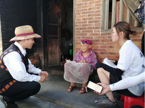 调研团随后对一位年龄高达93岁的苗族阿婆进行采访。据村民委员会主任介绍,阿婆的孙子现在是在伍军人,而她自己也是黎苗两族共同抗战时期的一批年轻人。调研团同阿婆和
