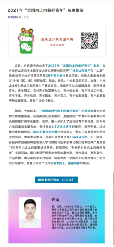 喜报 | 热烈祝贺致远班四期学子许阐获得“ 2021年全国向上向善好青年”称号!!